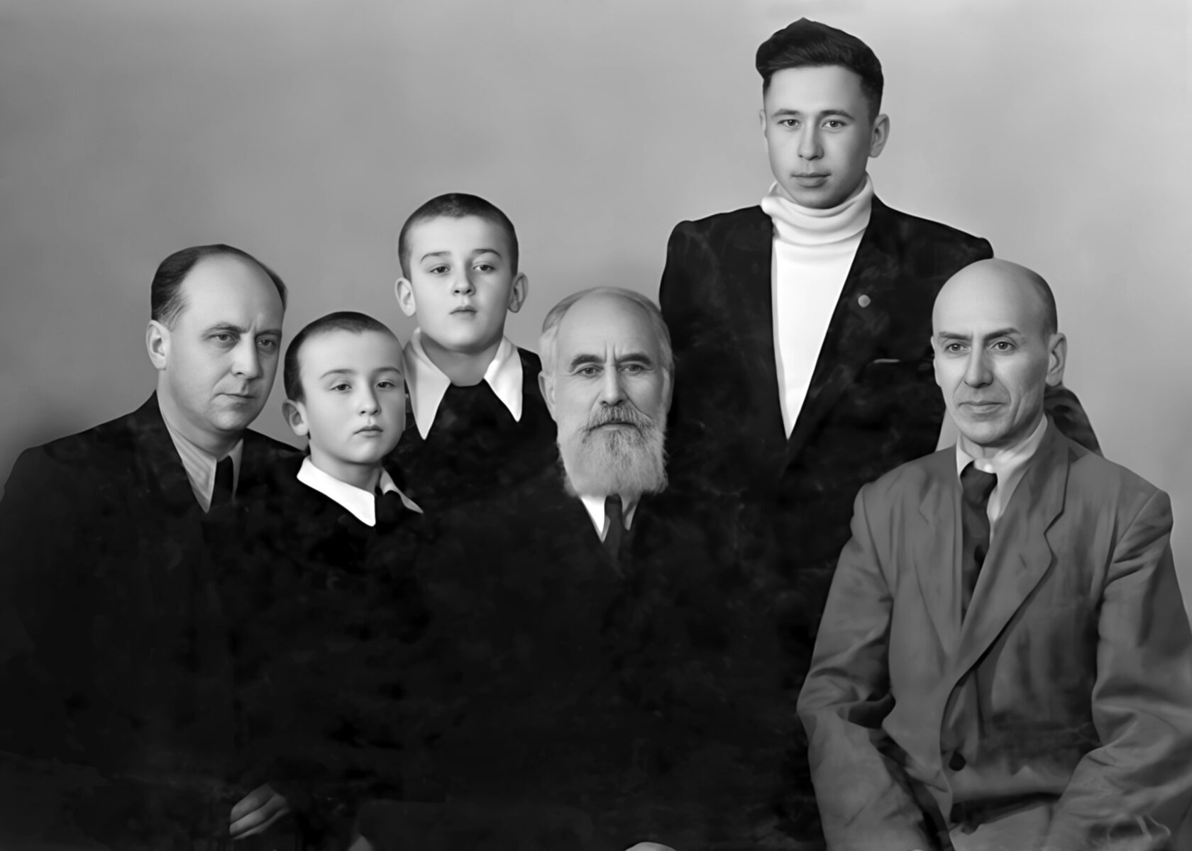 Мужчины рода Чабдаровых. Слева направо: Мухтар Зиганшевич с сыновьями Якубом и Ибрагимом, Муса Зиганшевич, Шамиль Мидхатович (будущий профессор и академик, на то время студент Казанского Авиационного института), Абдулхамит Зиганшевич. г. Казань. 10 февраля 1956 г.