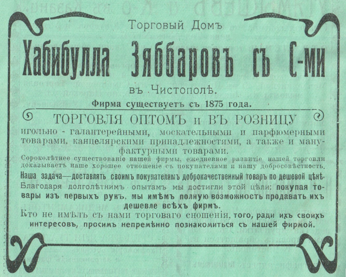 Хабибулла Зяббаров начал торговую деятельность в 1875 г. с открытия галантерейной лавки. 17 июля 1909 г. Зяббаровы зарегистрировали собственную фирму под названием Торговый Дом «Хабибулла Зяббаров с сыновьями в г. Чистополе». В основу предприятия был положен капитал в 10000 рублей, разделенный поровну между сыновьями Галиуллой (распорядитель) и Валиуллой Зяббаровыми. Братья вели оптовую и розничную торговлю канцелярскими принадлежностями, игольно-галантерейными, москательными, парфюмерными и мануфактурными товарами. Производили покупку и продажу охлопка (остаток после обработки волокнистых веществ), старых резиновых галош, рукавиц и тряпок. Годовой оборот семейного предприятия составлял до 20 000 рублей.